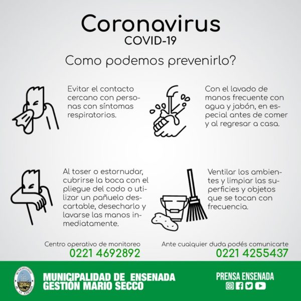 Ante los distintos casos de Coronavirus que se presentan en el país, desde la comuna se pide a todos los vecinos aumentar los cuidados para garantizar que no se esparza el virus y que se mantenga una higiene básica como la forma más eficaz de evitar contraer este virus.