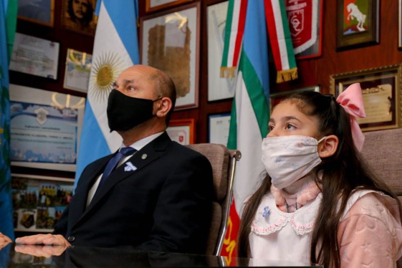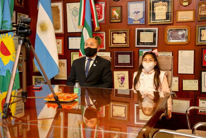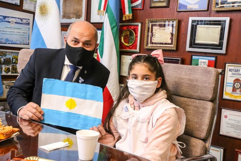 La alumna ensenadense Zoe Vega participó en compañía del intendente Mario Secco del acto de conmemoración del Día de la Bandera, con modalidad virtual, que encabezó el gobernador Axel Kicillof junto a alumnos bonaerenses de cuarto año de primaria de los 135 municipios de la provincia de Buenos Aires.