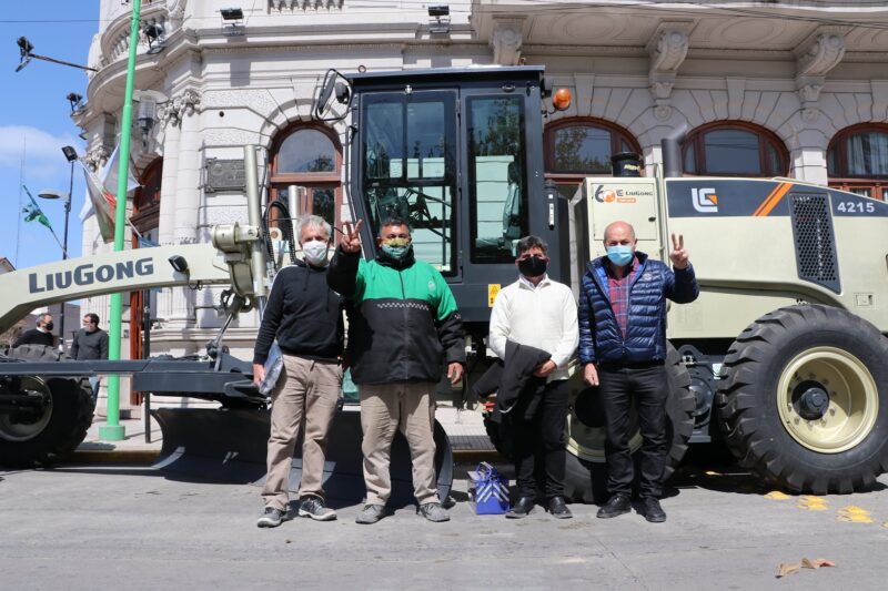 El intendente Mario Secco, el secretario municipal de Hacienda, Hugo Schneider y funcionarios del áreas de Obras Públicas y Servicios, recibieron las nuevas maquinarias en la puerta del Palacio Municipal.