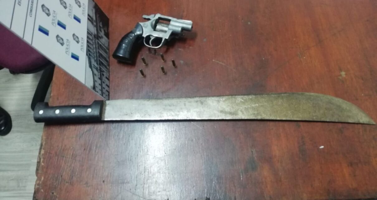 Ante esto, los efectivos lo persiguieron y lograron interceptarlo a los pocos metros. Tras identificarlo y requisarlo, procedieron a registrar su vehículo, hallando un revólver Pasper calibre 22, con cinco municiones intactas, y un machete.