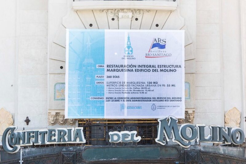 Astillero Rio Santiago comenzó los trabajos de restauración integral de los 130 metros cuadrados de la estructura metálica de la marquesina de la reconocida e histórica Confitería del Molino, ubicada en Capital Federal, a metros del Congreso de la Nación.