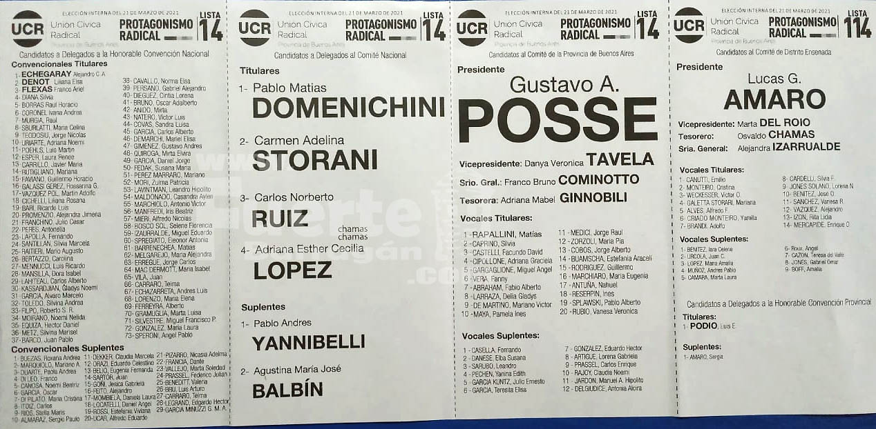 En las primeras líneas de cada uno de los cuatro cuerpos de la Boleta que se usará el 21 de Marzo, la lista Protagonismo Radical llevará como candidato al Convención Nacional en primer término a Alejandro Echegaray, a Pablo Domenichini de Delegado al Comité Nacional, Gustavo Posse como Presidente del Comité Provincial y a Lucas Amaro como candidato al Comité de Distrito de Ensenada, acompañado por Marta del Roio como vice.