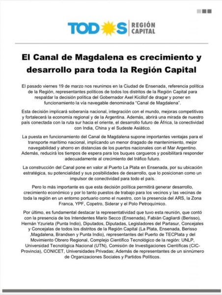 En ese marco, los ediles del Frente de Todos de Ensenada (Interbloque Sekista), Berisso, La Plata, Punta Indio, Magdalena y Brandsen) elaboraron un comunicado en conjunto dirigido a toda la sociedad, donde explican los beneficios y las ventajas que traería la obra a nuestra región.