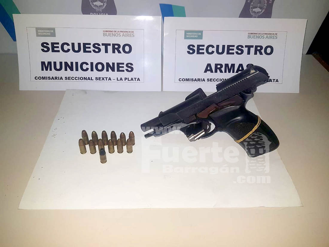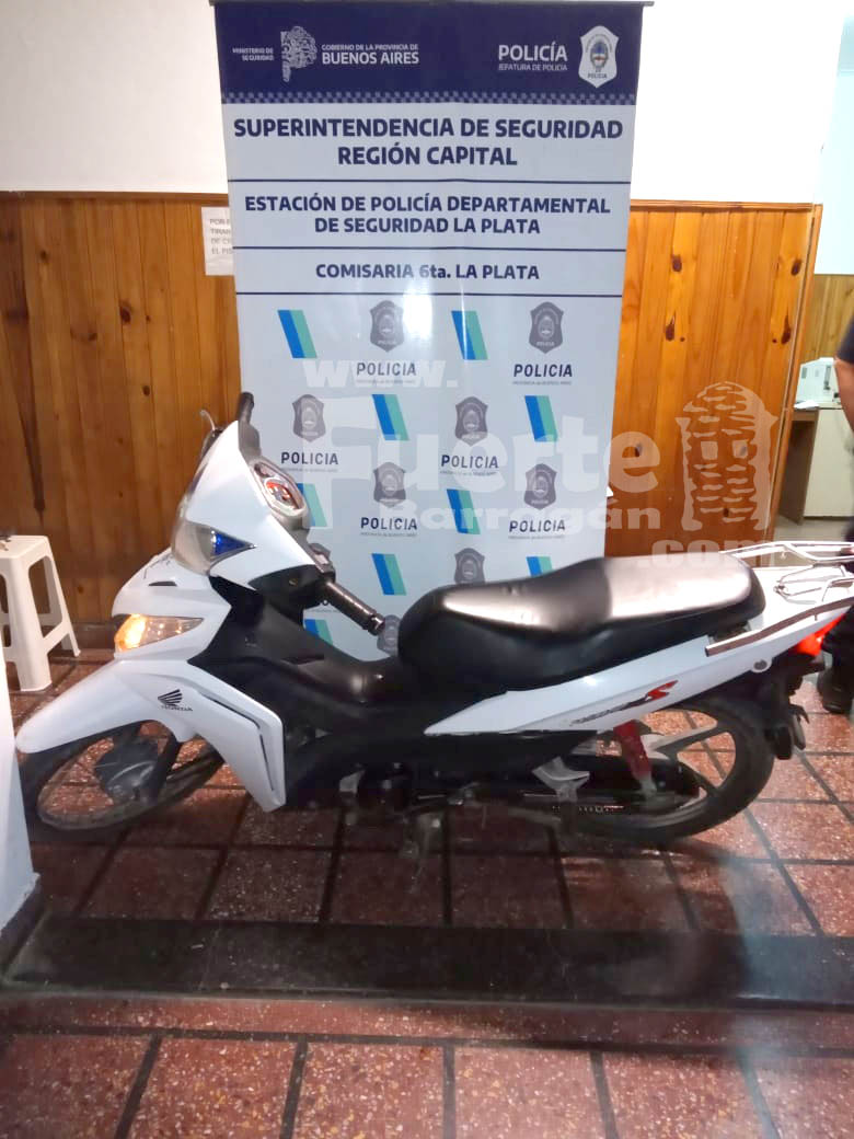 Una vez trasladado él y la moto secuestrada a la Comisaría Sexta de Tolosa, fue identificado con nombre y apellido, 37 años de edad, oriundo de la localidad de El Dique, y se le secuestraron una Pistola Bersa Thunder, calibre 9 mm con cargador, 13 cartuchos 9mm intactos, y la motocicleta Honda Wave color blanca, sin dominio colocado.