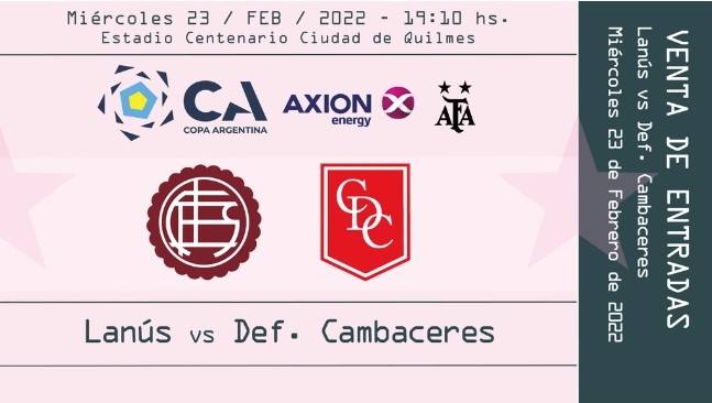 Este martes, de 10 a 18, y el miércoles, de 10 a 14, se venderán únicamente las entradas para el partido que Defensores de Cambaceres jugará ante Lanus, en la sede social de San Martin 715. No habrá expendio en la cancha de Quilmes.