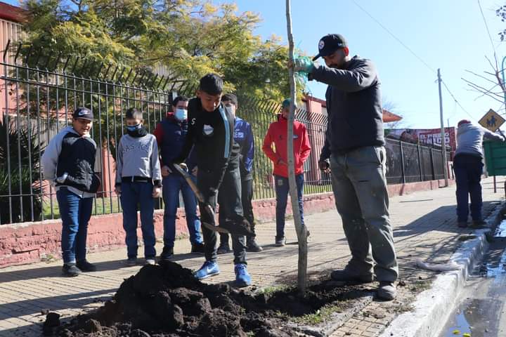 Junto a los estudiantes y docentes de la Escuela Secundaria N° 1, se llevó a cabo una jornada de concientización y forestación: jóvenes de la orientación Ciencias Naturales plantaron 13 árboles en las veredas del establecimiento