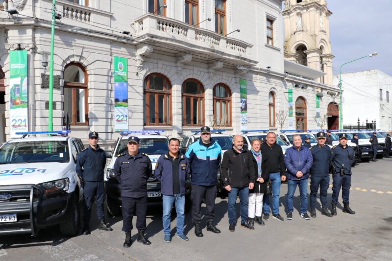El Ministerio de Seguridad de la Provincia de Buenos Aires entregó 10 nuevas camionetas a nuestra ciudad, las cuales fueron presentadas por el intendente Mario Secco frente al Palacio Municipal.