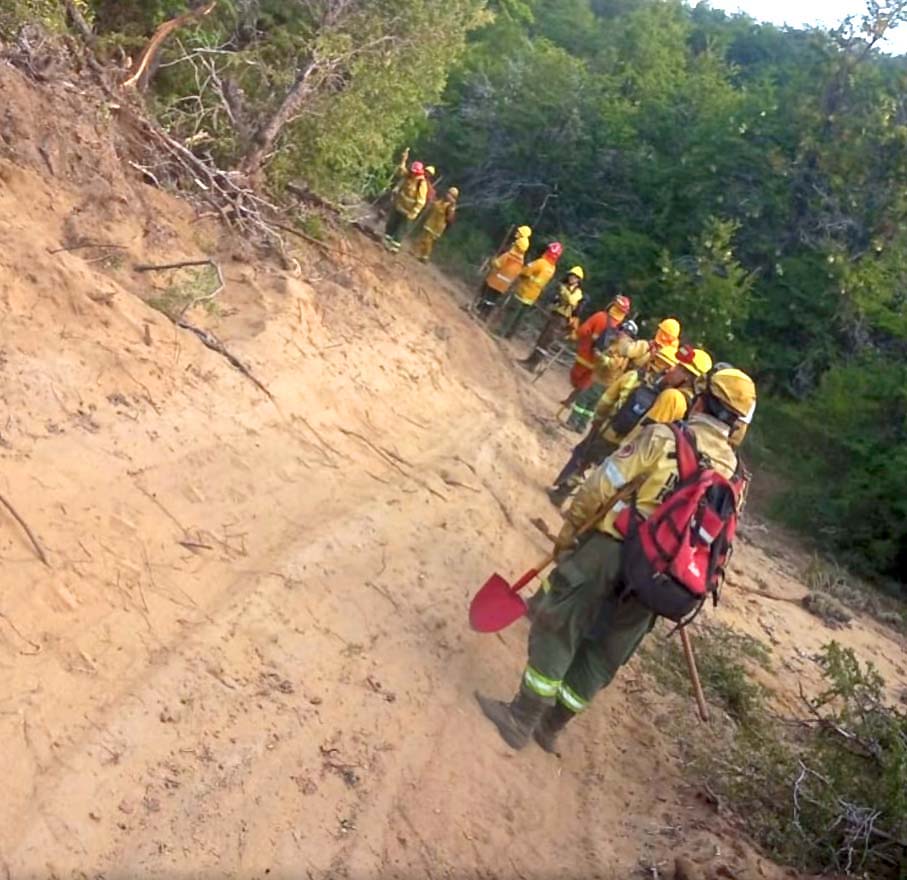 Las Cuadrillas trabajaron sobre sector de cabeza, construyendo una línea de defensa en la trayectoria del incendio mediante el uso de herramientas manuales. También se trabajó con motosierras a los fines evitar que las llamas llegaran a un cañadón con combustible, quedando todo este sector en estado contenido.