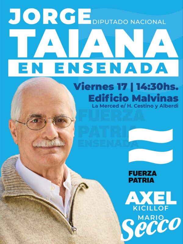 El candidato a diputado nacional por Fuerza Patria, Jorge Taiana, visitará Ensenada este viernes 17 de octubre a las 14:30 horas en el Edificio Malvinas, ubicado en La Merced entre H. Cestino y Alberdi.